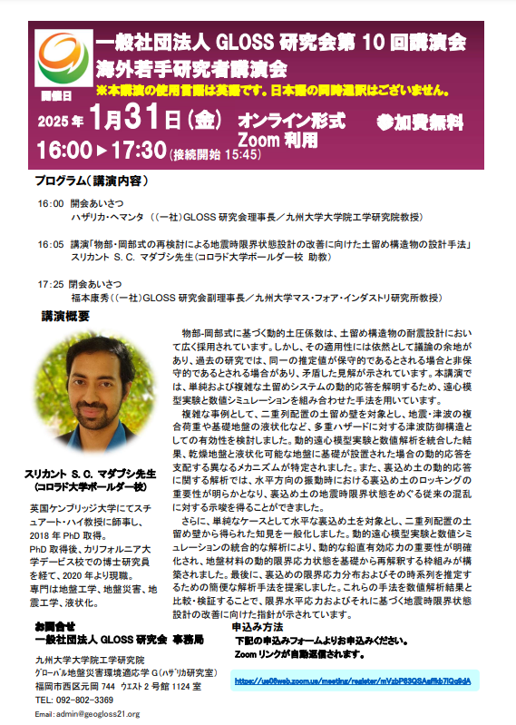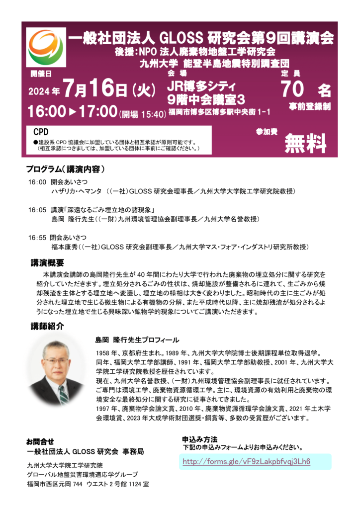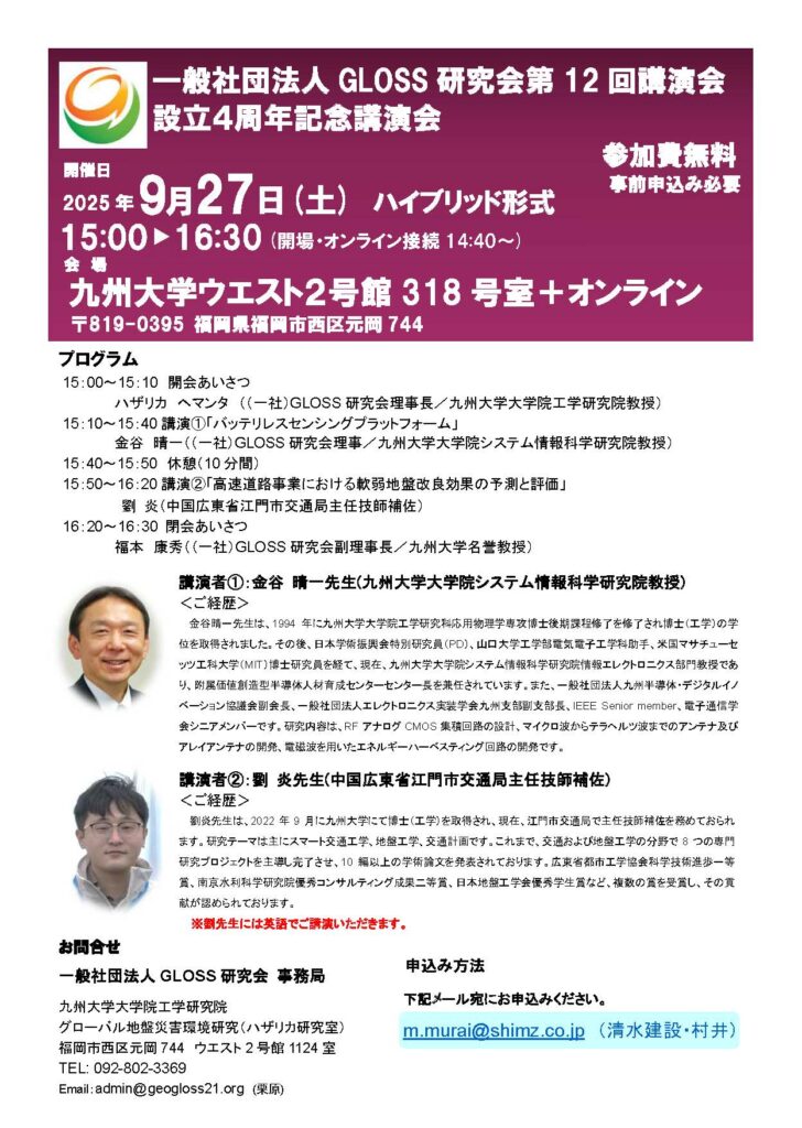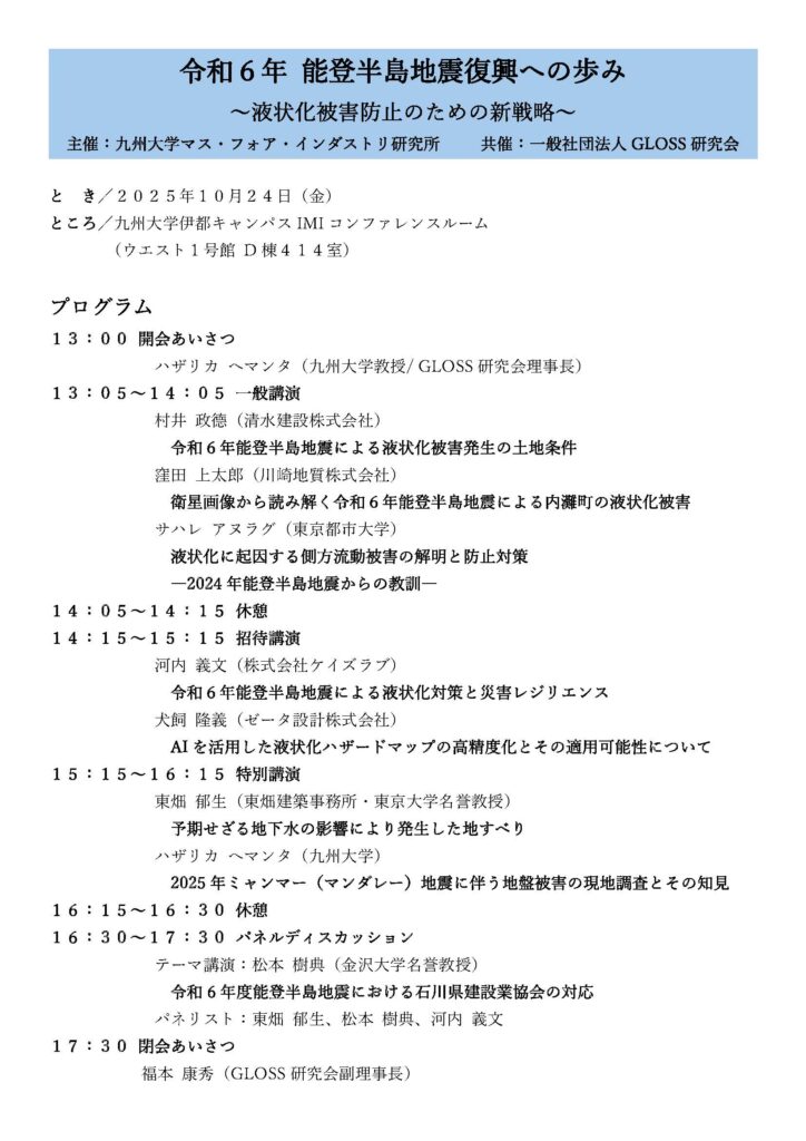 Activity Report October 24th, 2025: The Path to Recovery from the 2024 Noto Peninsula Earthquake September 27th, 2025: 12th Public Lecture of GLOSS4th Anniversary Commemorative Lecture April 12th, 2025: 11th Public Lecture of GLOSSRetirement Commemorative Lecture by Professor Yasuhide Fukumoto January 31st, 2025: 10th Public Lecture of GLOSSInvited Lecture by Young International Researchers July 16th, 2024: 9th Public Lecture of GLOSSSupport: NPO Waste Geo-Engineering Research AssociationKyushu University Noto Peninsula Earthquake Special Investigation Team December 5th, 2023: 8th Public Lecture of GLOSSSpecial Invited Lecture by International Researcher July 21st, 2023: 7th Public Lecture of GLOSSSpecial Invited Lecture by International Researchers May 26th, 2023: 6th Public Lecture of GLOSSPublication Commemorative Lecture 『Practical Applications and Trends in Ground Improvement Technology』 September 22, 2022: 5th Public Lecture of GLOSS『Special Commemorative Lecture for the First Anniversary of the GLOSS Research Association』 July 1, 2022: 4th Public Lecture of GLOSS&The 1st Public Lecture of Kyushu University IMI Short-term JointResearch Project for Year 2022『Study of On-site Application Method of Slope Disaster Countermeasures with Reduced Environmental Impact』 March 11, 2022: 3rd Public Lecture of GLOSS『Special Lecture Commemorating 11 Years of the Great East Japan Earthquake Disaster』 January 21, 2022: 2nd Public Lecture of GLOSS&The 3rd Public Lecture of Kyushu University IMI Short-term JointResearch Project『Pursuit of Mechanism of Slope Failures and Slope DisasterCountermeasures with Reduced Environmental Load』 December 4, 2021: GLOSS Establishment Ceremony Commemorative Lectures & The 2nd Public Lectures of IMI Short-term Joint Research Project 『 Pursuit of mechanism of slope failures and slope disaster countermeasures with reduced environmental load』 October 25, 2021: 2021 International Exchange Activity of GLOSS